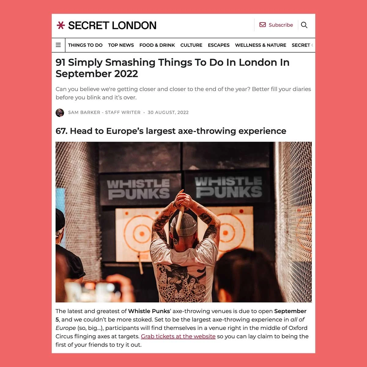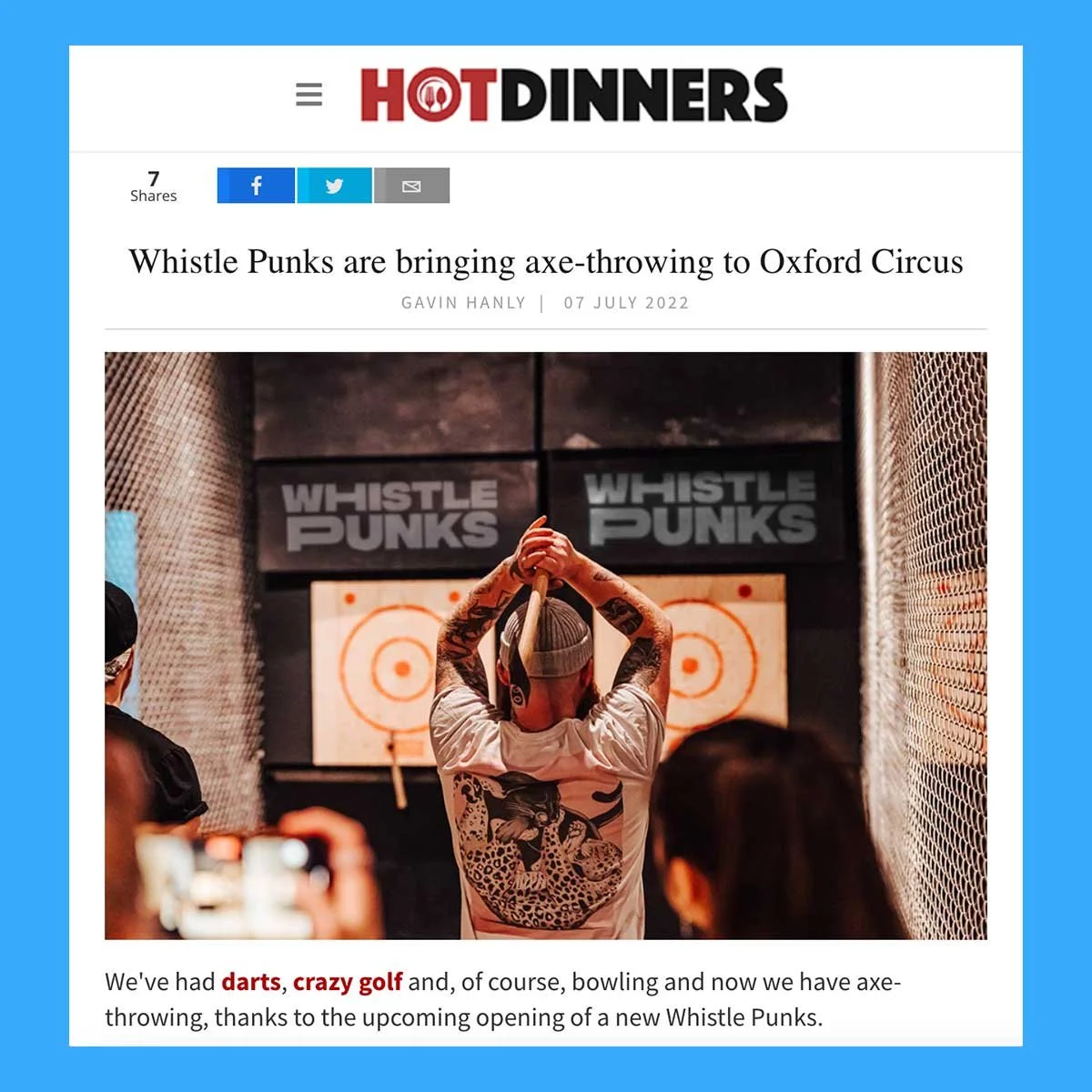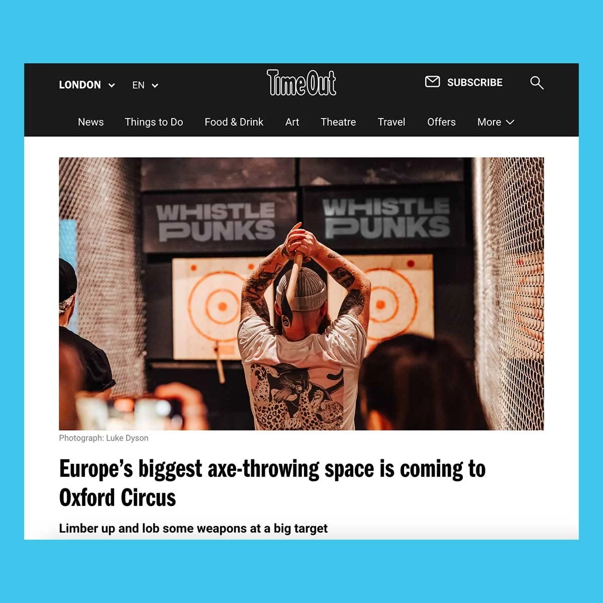 "Cocktail bars get an edge at Whistle Punks’ new axe-throwing venue. The new 7,000 sq ft site, costing about £1 million, is in a former Busaba Eathai restaurant. It will have nine lanes, a bar serving cocktails, craft beers and ciders plus a kitchen serving sourdough pizza."